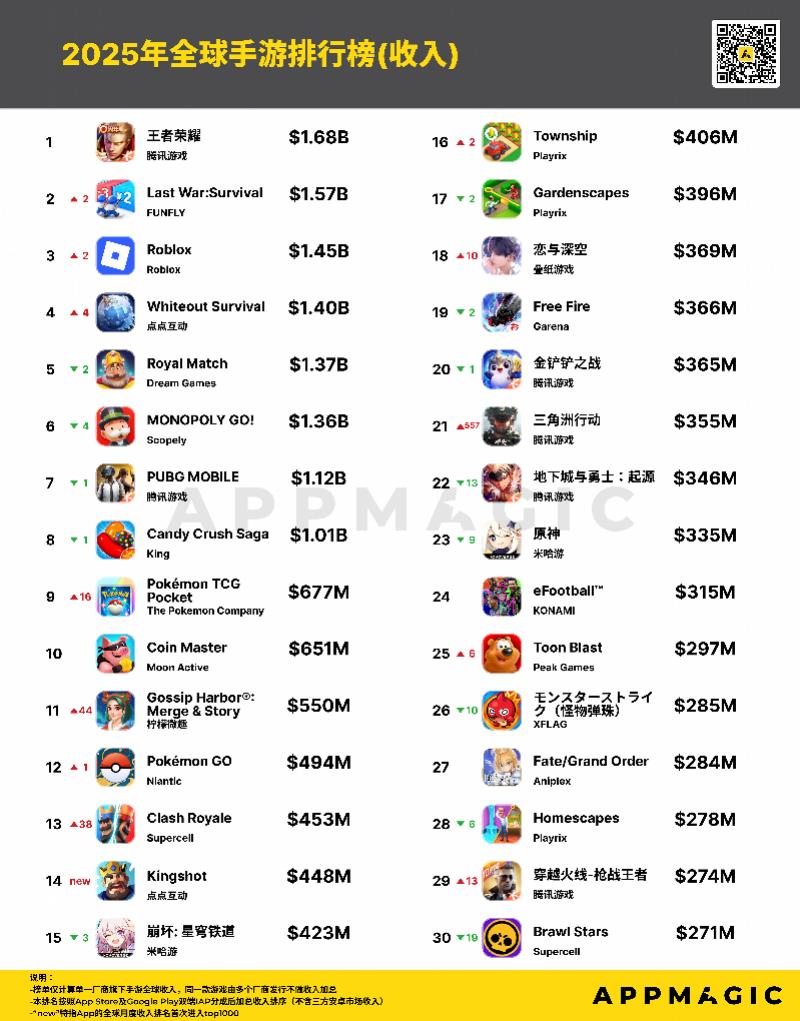 FUNFLY的《Last War: Survival》以15亿美元(约105亿元人民币)收入跃居收入第二,同比增长40%,超越《Roblox》。柠檬微趣的合并养成游戏《Gossip Harbor》,全年收入达5.5亿美元(约38亿元人民币),排名上升至收入榜第11位。米哈游《崩坏:星穹铁道》与《原神》分别以4.23亿美元(约30亿元人民币)和3.35亿美元(约23亿元人民币)位列第15与第23名。叠纸的乙女游戏《恋与深空》收入同比增长36%至3.69亿美元(约26亿元人民币),排名第18。