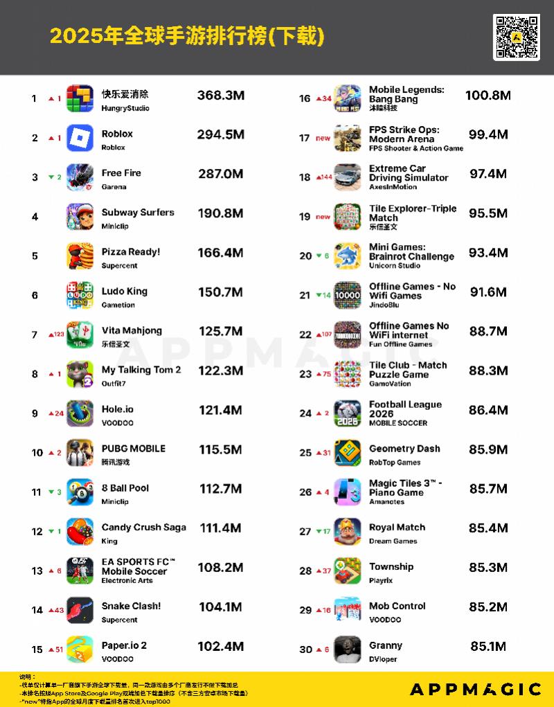 多款中国厂商产品成功上榜。其中,Hungry Studio的《快乐爱消除》以3.68亿次的下载量登顶。乐信圣文旗下两款休闲益智类手游《Vita Mahjong》与《Tile Explorer - Triple Match》分别位列下载榜第7与第19名。沐瞳科技旗下MOBA手游《Mobile Legends: Bang Bang》2025年全年下载破亿,同比增长约35%,位列全球手游年度下载榜第16名。