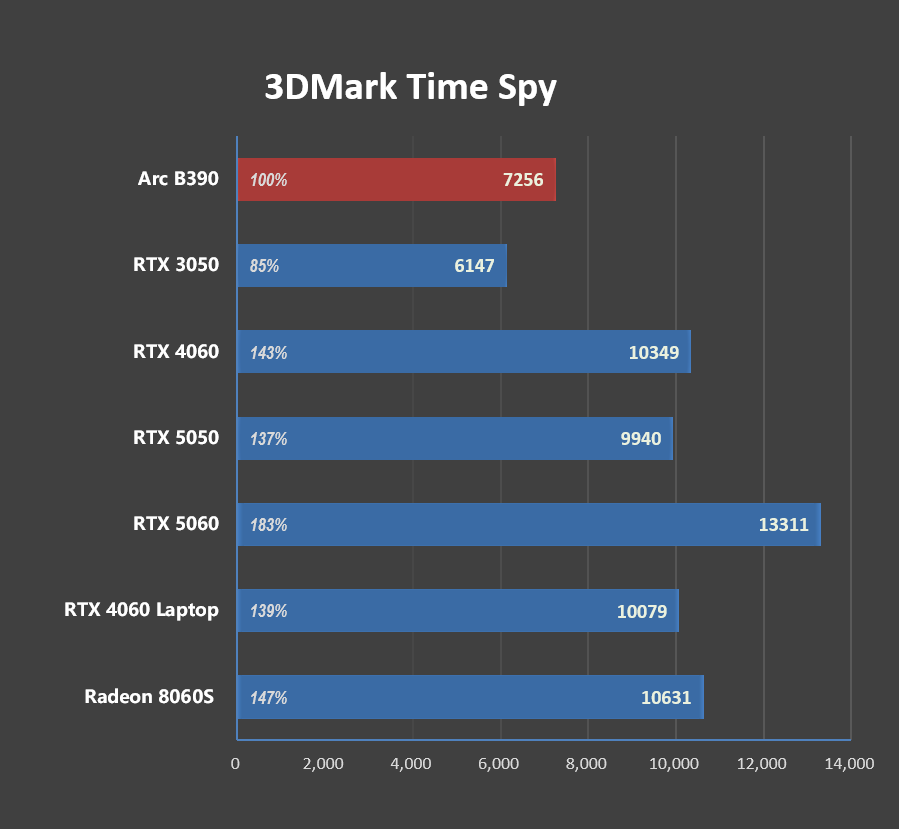 酷睿 Ultra X9 388H 集成的 Intel Arc B390 核显,基于 Xe3 架构,采用台积电 N3E 制程,拥有 12 个 Xe 核心和 12 个光追图形单元,96 个全新 XMX 引擎单元,支持 XeSS 3.0 超分技术与 4 倍多帧生成,GPU 频率为 2.5GHz,L2 缓存 16MB,AI 算力达到了 120 TOPS,可加速视频剪辑、图像渲染等创意工作,例如在 Adobe Premiere 中导出 4K 视频速度较上代提升 43.9%。在3DMark Time Spy测试中,其图形分数可达7200分以上,比肩入门级桌面版独立显卡,这一规格在集成显卡中相当少见,彻底改变了用户对“核显性能孱弱”的认知。