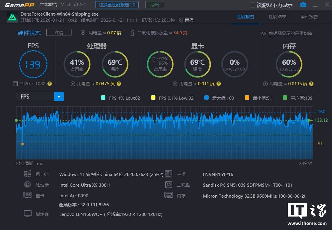 《三角洲行动》作为腾讯旗下的战术射击网游,对 CPU 多核性能与 GPU 图形处理能力均有一定要求。在 1080P 分辨率 + 低画质预设 + XeSS 性能档 + XeSS 帧生成设置的“极客模式” 下,联想小新 Pro 16 GT AI 元启版对战数据如下: