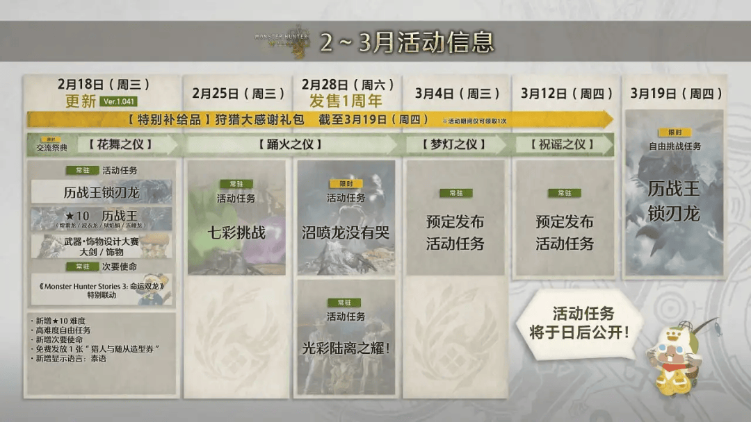 2月18日至3月19日还有一周年纪念活动,登录就送“狩猎大感谢礼包”,复刻往期“交流祭典”,每周还有新活动任务拿限定装备。